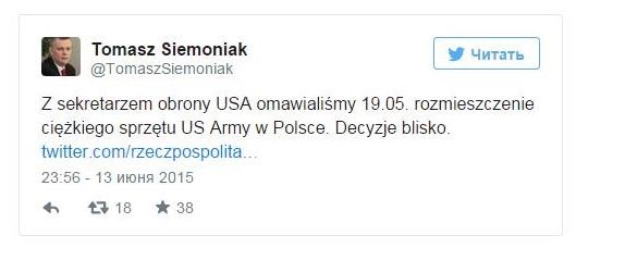 Министр обороны Польши Томаш Семоняк сообщил, что Варшава действительно ведет переговоры с США о размещении на своей территории американского тяжелого вооружения.